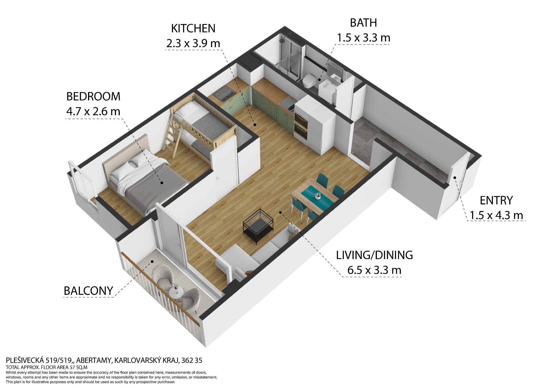 Apartmán má celkovou podlahovou plochu 56 m² a skládá se z obývacího pokoje s kuchyňským koutem a přímým vstupem na lodžii, samostatné ložnice, koupelny s vanou a toaletou a vstupní předsíně. Byt se prodává kompletně vybavený, včetně moderní kuchyňské linky, vestavěných spotřebičů a nábytku na míru. Vytápění je zajištěno tepelným čerpadlem s možností dálkového ovládání přes mobilní aplikaci. Vše je zcela nové, připravené k okamžitému užívání bez nutnosti dalších investic.
